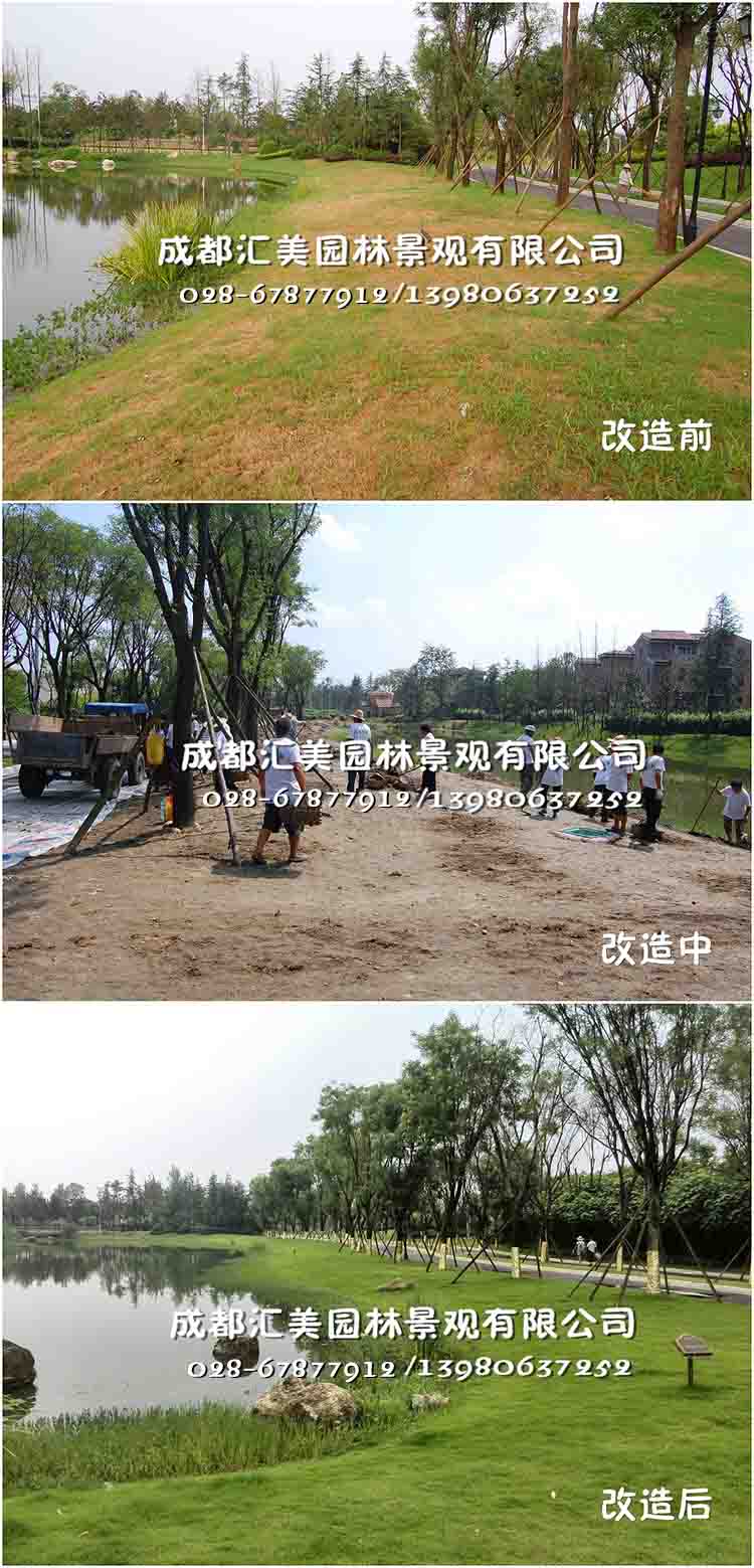 成都匯美園林景觀有限公司于2013年對建發(fā)淺水灣別墅區(qū)一期湖畔草坪進行施工改造,改造面積約1萬平方米。由于時間緊任務(wù)重,我司抽調(diào)30余名員工僅用4天時間便完工。雖然工期短,但我司嚴(yán)格把控施工流程和施工工藝,確保了改造后的草坪品質(zhì)。