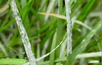 初白色,后污白色、灰褐色。霉層表面有白色粉狀物,后期霉層中出現(xiàn)黃色、橙色或褐色顆粒。隨病情發(fā)展,葉片變黃,早枯死亡,一般老葉較新葉發(fā)病嚴(yán)重。發(fā)病嚴(yán)重時,草坪呈灰白色,像撒了一層白粉,受震動會飄散,該病通常春秋季發(fā)生嚴(yán)重。