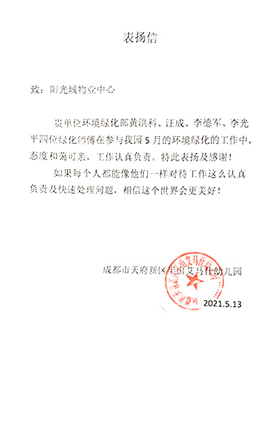 近日,匯美園林收到陽(yáng)光城物業(yè)“半山艾馬仕幼兒園”發(fā)來(lái)的表?yè)P(yáng)信,以表彰項(xiàng)目工作人員積極配合處理成都市天府新區(qū)半山艾馬仕幼兒園綠化工作,及對(duì)我公司認(rèn)真積極優(yōu)質(zhì)的綠化養(yǎng)護(hù)服務(wù)給予充分的肯定。
